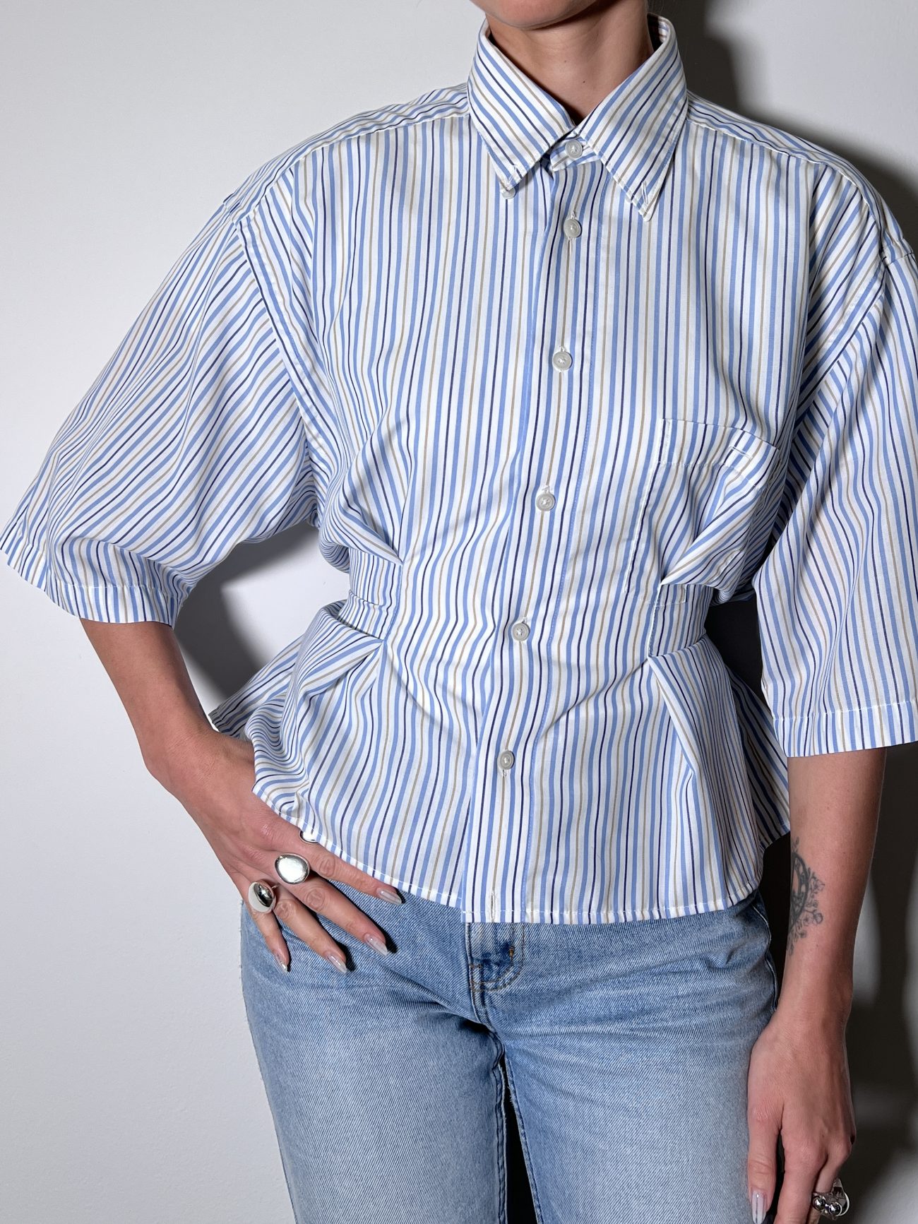 Sustainability: Thoughtfully reimagined, this piece is reconstructed and upcycled from a highquality men’s shirt.